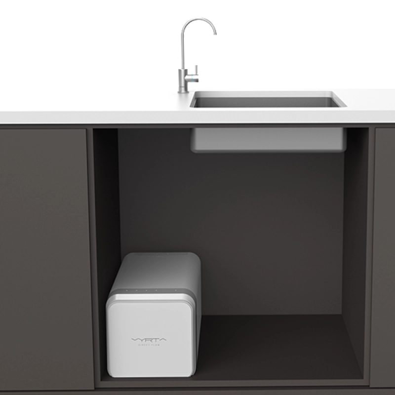 Agua pura para lavar los vegetales y las frutas. Agua recién purificada para cocinar y realzar los sabores de las infusiones y del café y mantener la transparencia cristalina de los cubitos de hielo. Agua pura para acompañar tus comidas. Explora nuevas dimensiones en tu cocina con RO Vyrta.